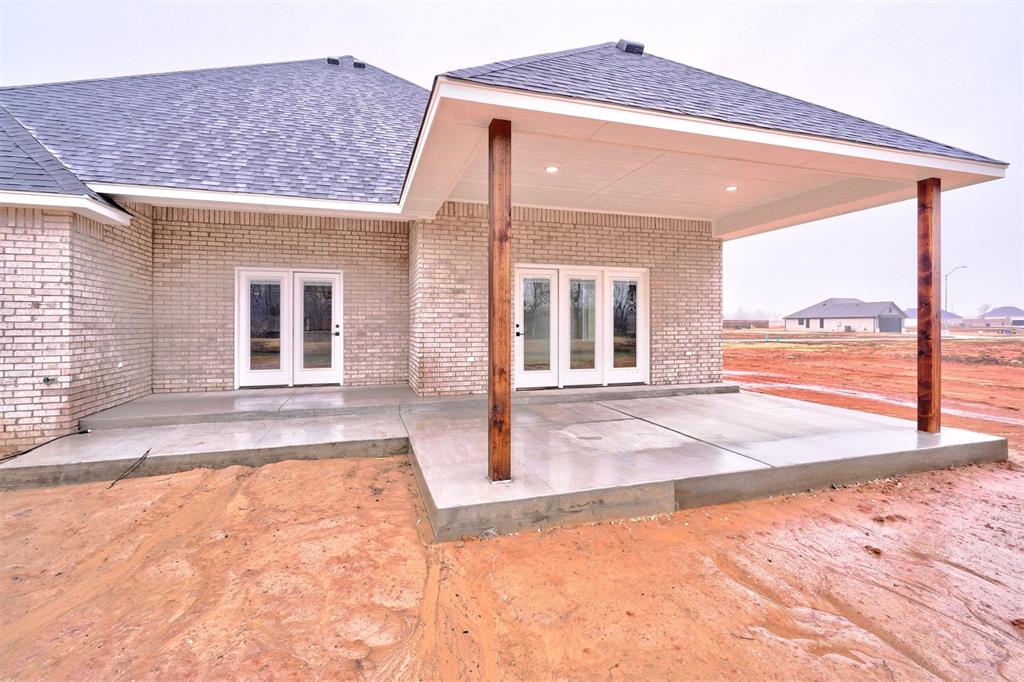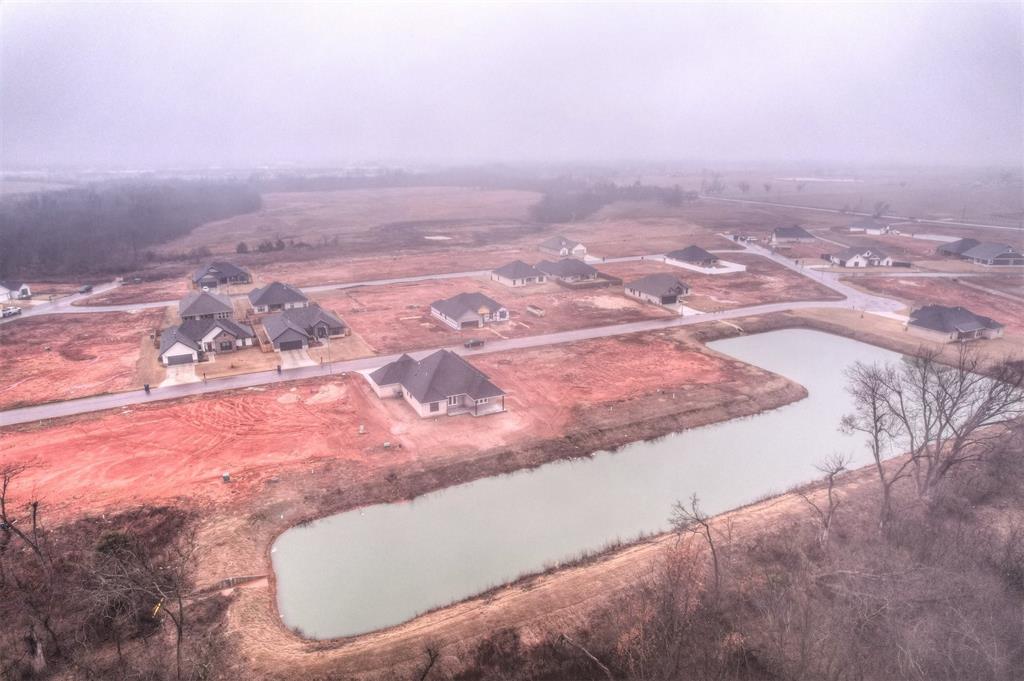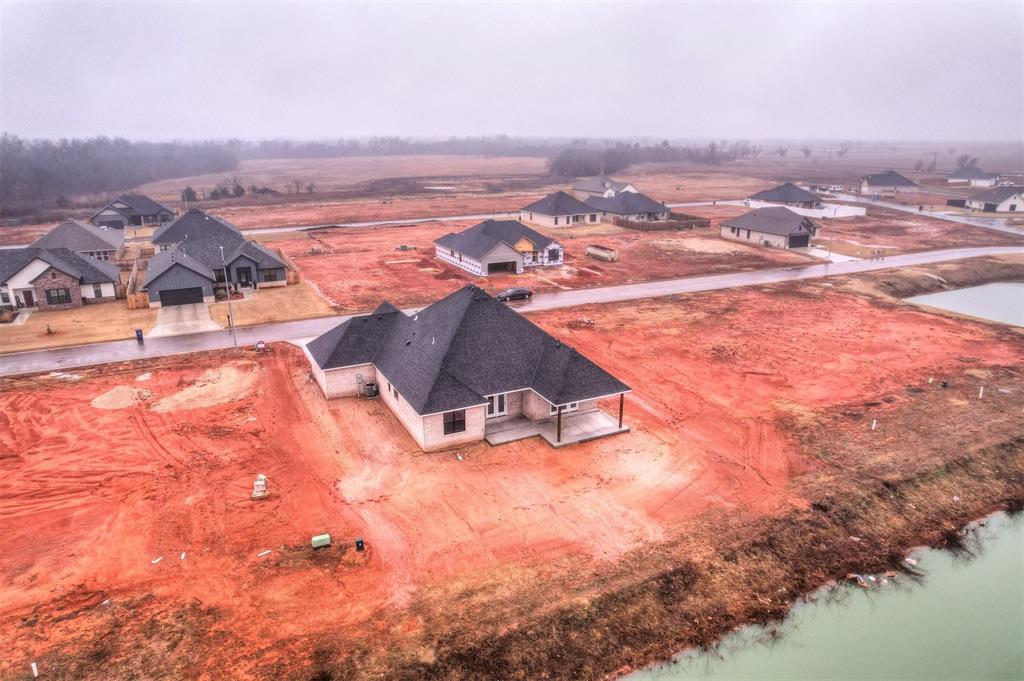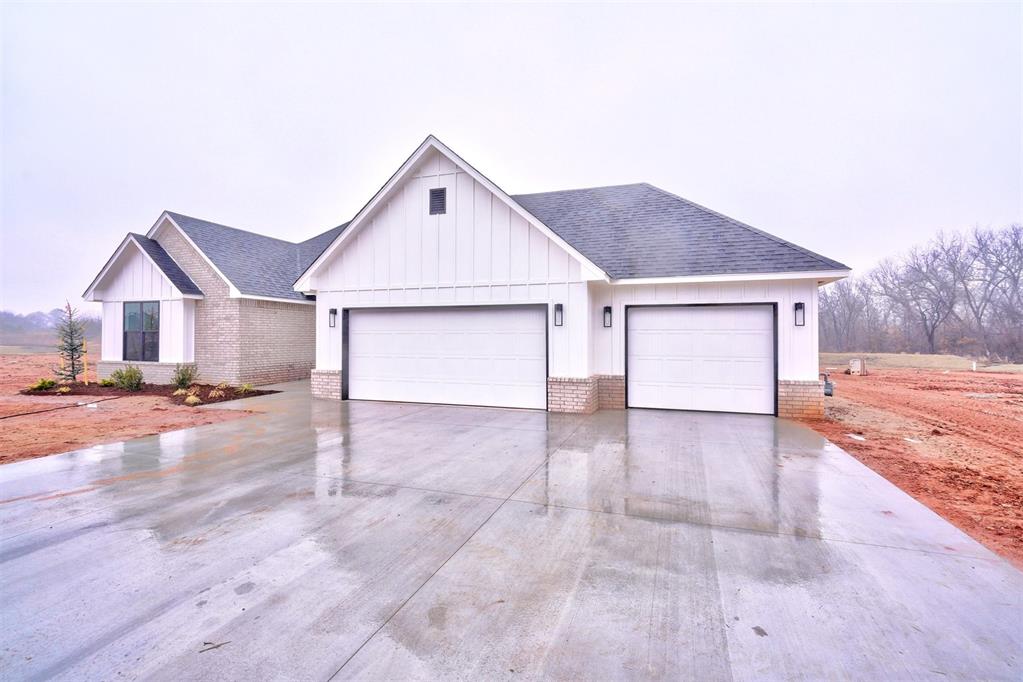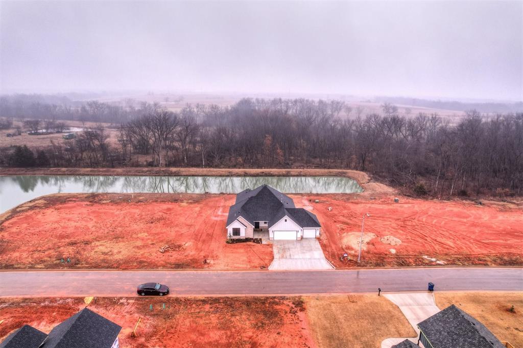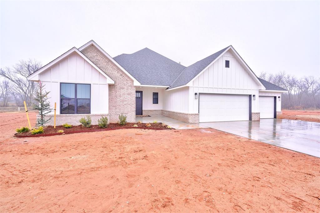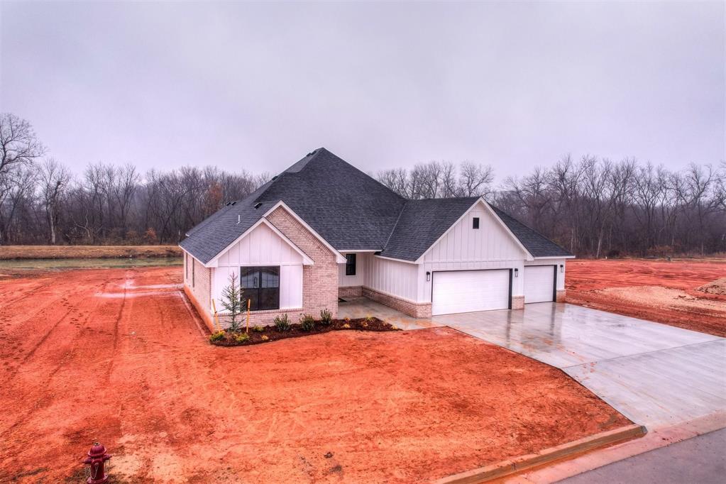 Step into this beautifully designed modern farmhouse by Greg Brown Homes, perfectly located in Trails End Addition and within the highly sought-after North Rock Creek School District. This 4-bedroom, 2.5-bath home blends style and function with wood-look tile floors throughout all living areas, creating a warm yet durable space for everyday living. The open-concept living, dining, and kitchen is an entertainer’s dream, featuring a huge island, pantry, built-in oven, gas cooktop, microwave, and sleek quartz countertops. Brushed gold hardware adds a touch of elegance, while a wall of glass doors invites natural light and leads to the expansive covered patio overlooking the pond—perfect for relaxing or entertaining. The primary suite is a luxurious retreat, offering a spa-like ensuite bath with a freestanding soaking tub, oversized walk-in shower, and double vanities. A spacious walk-in closet completes the suite. The huge laundry room is thoughtfully designed with a black granite farmhouse sink, ample storage cabinets, and a built-in mudroom bench. A stylish powder room provides convenience for guests. Additional highlights include a 9-foot entry door on the large front porch, a 3-car garage with a triple driveway, and easy access to I-40 (just 1 minute away)—making Tinker AFB (30 min) and Bricktown (35 min) a breeze to reach. Don’t miss this opportunity to own a thoughtfully designed new home in a prime location. Schedule your showing today!